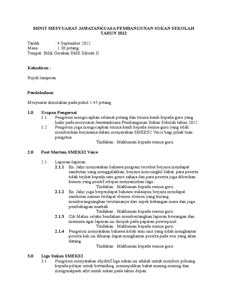 Minit Mesyuarat Jawatankuasa Pembangunan Sukan Sekolah Tahun 2012 Pdf